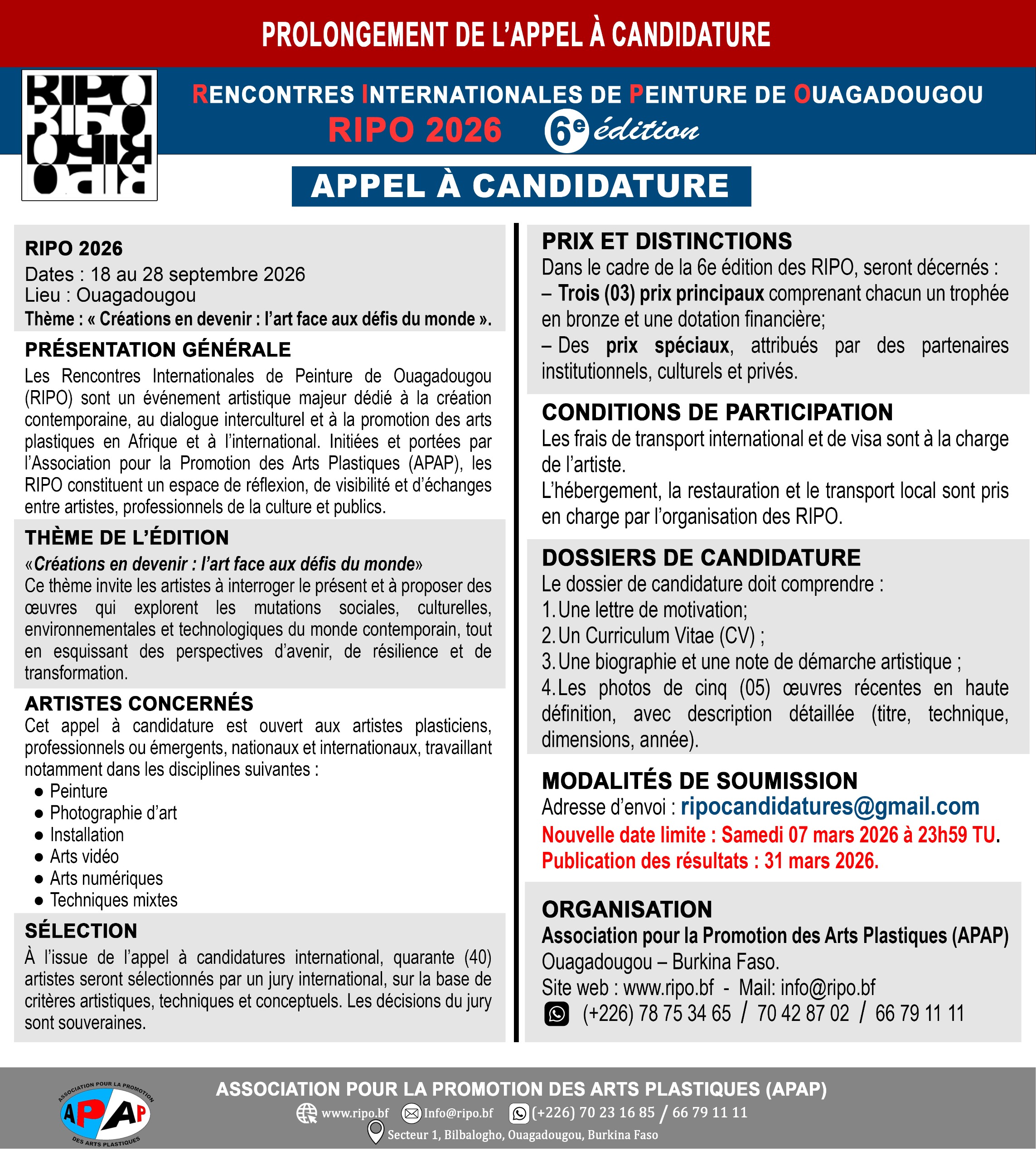 Une exposition internationale à la maison du peuple de Ouagadougou. On trouvera au cœur de cette exposition multipolaire des opportunités de rencontres entre artistes africains et du reste du monde RIPO